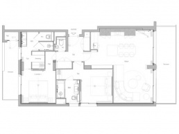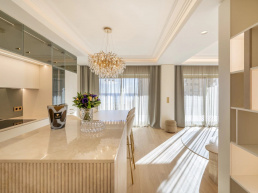 It consists of: an entrance hall with cupboards, a double living room with sea view, an open kitchen, a master suite with access to the terrace, full shower room and adjoining dressing room, a second bedroom with full bathroom and dressing room, as well as an outdoor laundry room. All rooms open onto a terrace.
